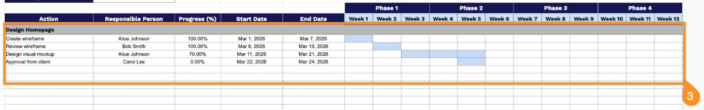 3. List all your tasks. For each task, specify the actions that need to be completed, assign a responsible person, track progress, and set start and end dates. Then, visually map each task’s duration across the phases using colors to make the timeline easy to follow.