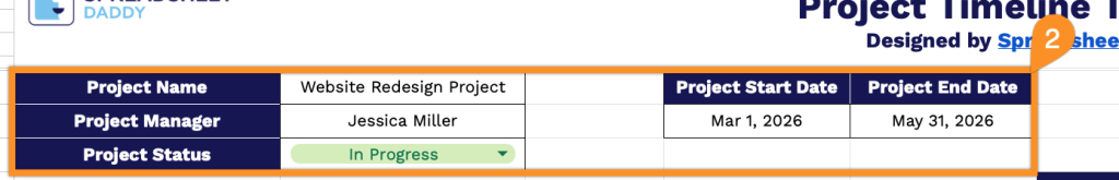 - Comprehensive project overview section: The header includes essential fields for Project Name, Project Start Date, Project End Date, Project Manager, and Project Status, providing a complete snapshot of your project’s key information and current state at a glance.