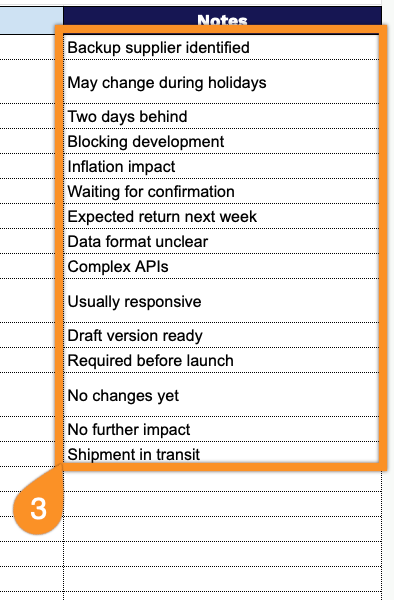 - Mitigation planning with timeline management: The Mitigation column, paired with the Due Date field, allows you to document specific action plans for addressing each item, set deadlines for resolution, and maintain a clear roadmap for risk prevention and issue resolution, with an additional Notes column for supplementary context and updates.