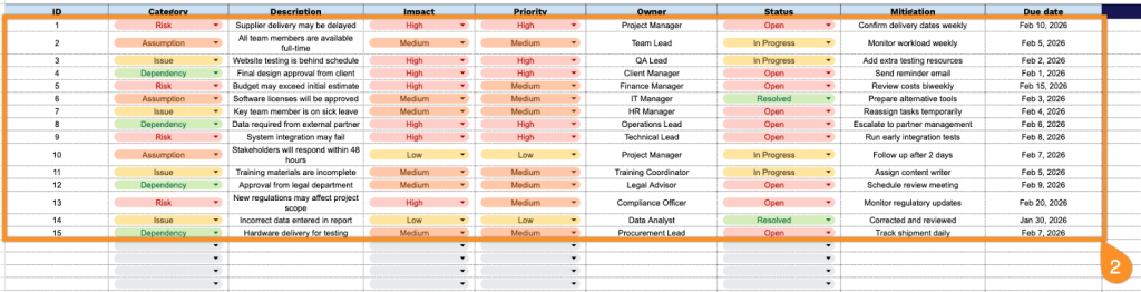 - Category classification system: The Category column enables you to easily distinguish between the four RAID elements, Risks (potential future problems), Assumptions (conditions presumed valid), Issues (current problems requiring resolution), and Dependencies (external factors affecting progress), keeping your project management organized and comprehensive.