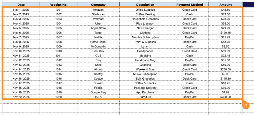 • Comprehensive tracking columns: Seven essential fields to capture every detail of your receipts, including Date, Receipt Number, Company name, Description of purchase, Payment Method, Amount, and a Notes field for additional context or categorization