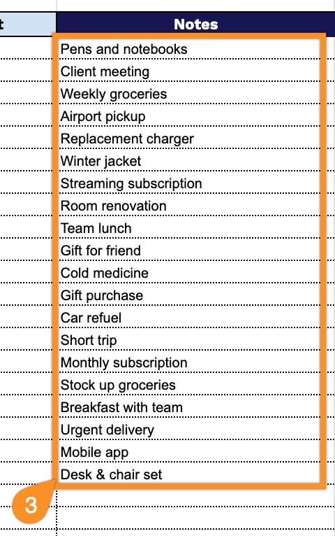 • Chronological organization: The Date column enables you to sort and review expenses by time period, making it easy to compile monthly, quarterly, or annual expense reports