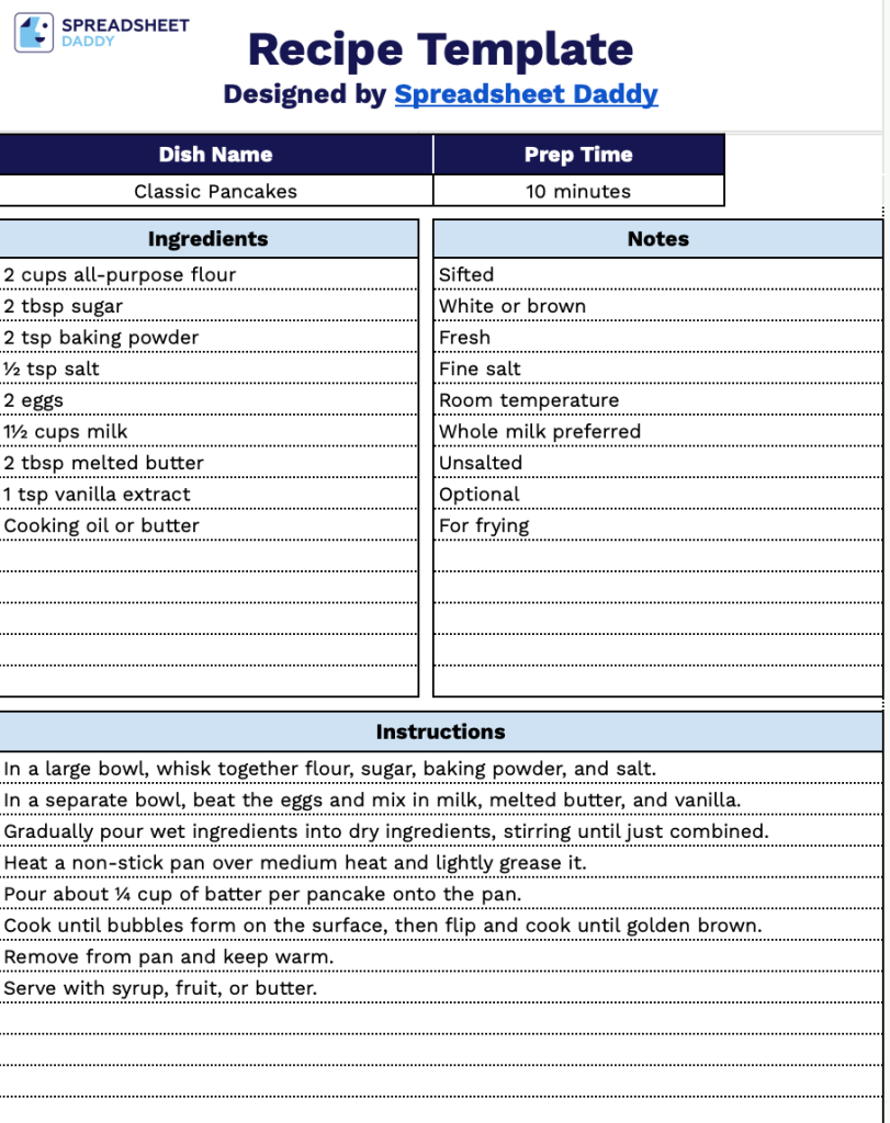 Our free recipe template is professionally designed and available in Google Sheets, Word, Google Docs, Excel, and PDF.