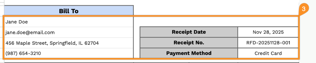 3. Fill in the “Bill To” details, along with the receipt date, receipt number, and payment method.