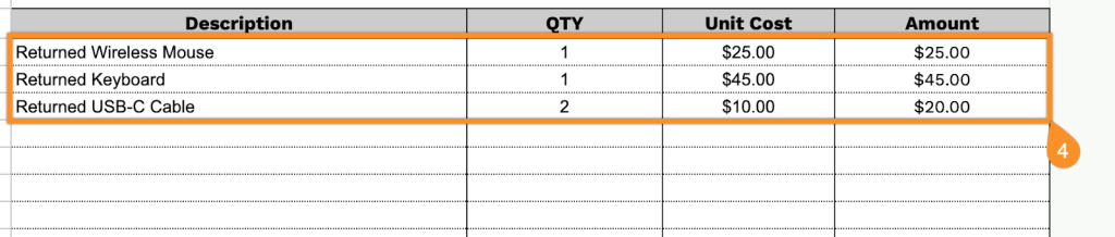 4. List the items being refunded. Include the quantity and price for each item, and the template will automatically calculate the line totals.