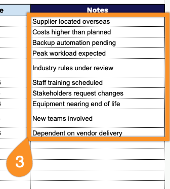 3. Use the Notes section to capture assumptions, dependencies, escalation details, or any updates that provide additional context.