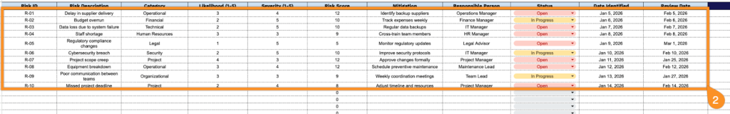 • Assignment and timeline tracking fields: Dedicated columns for Responsible Person, Status, Date Identified, and Review Date enable clear accountability by assigning risk ownership, tracking current progress, and establishing review schedules to ensure risks are actively monitored and managed over time.