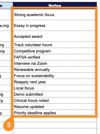 - Application progress tracking system: The Application Status column allows you to monitor where each scholarship stands in your process, whether it’s researched, in progress, submitted, or decided, giving you an at-a-glance view of your entire scholarship pipeline and helping you prioritize which applications need immediate attention.