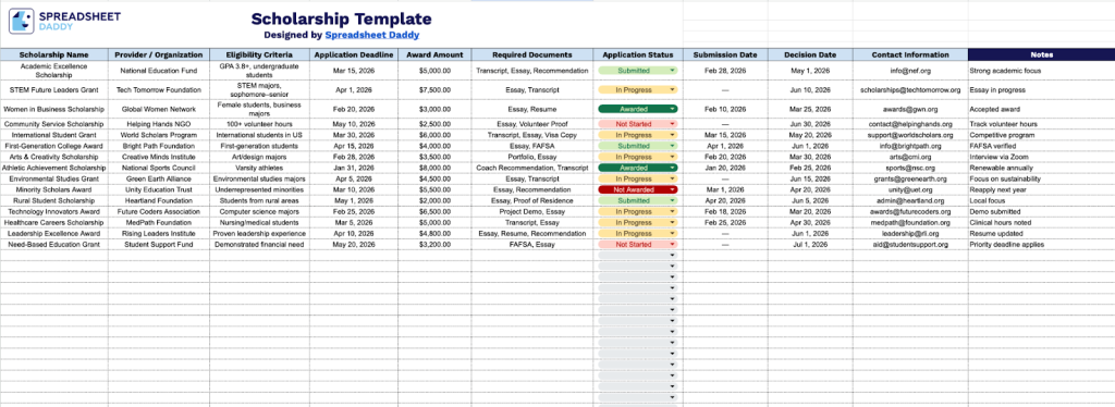 - Comprehensive scholarship tracking columns: The template includes 11 dedicated fields covering Scholarship Name, Provider/Organization, Eligibility Criteria, Application Deadline, Award Amount, Required Documents, Application Status, Submission Date, Decision Date, Contact Information, and Notes, allowing you to capture every critical detail about each scholarship opportunity in a single, organized row.