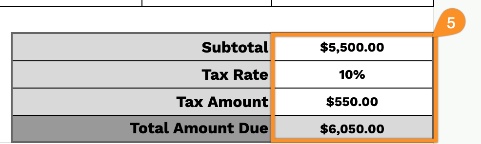 5. Apply the appropriate tax rate. The template will automatically calculate the subtotal, tax amount, and total amount due.