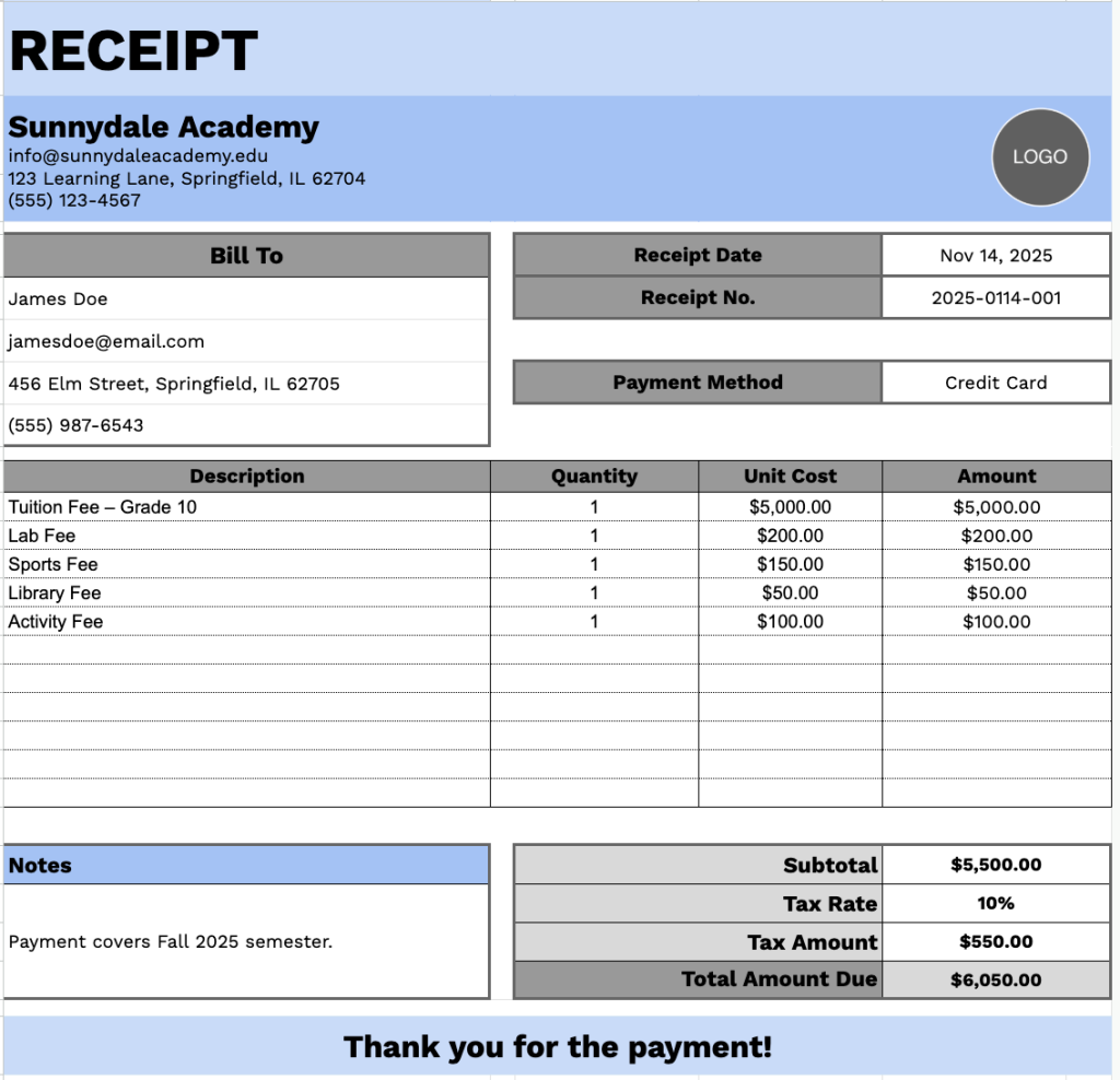 Free☝️ School Receipt Template (Google Sheets, Excel, Word, Google Docs, & PDF Downloads)