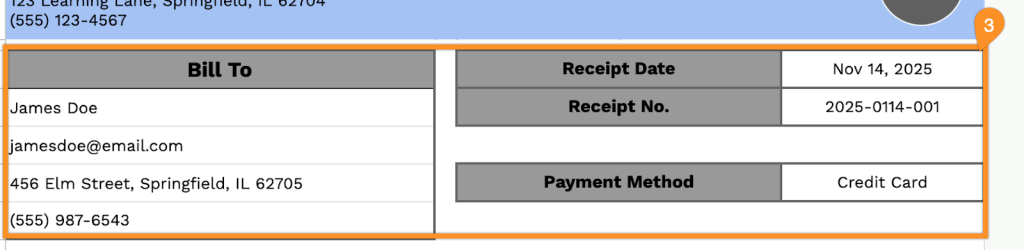 3. Fill in the “Bill To” information, along with the receipt date, receipt number, and payment method.
