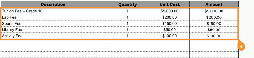 • Multi-row itemization table: A table with four structured columns (Description, Quantity, Unit Cost, Amount) enables you to list tuition fees, activity charges, meal plans, textbooks, uniforms, or additional school services with a precise pricing breakdown for transparency and clarity.