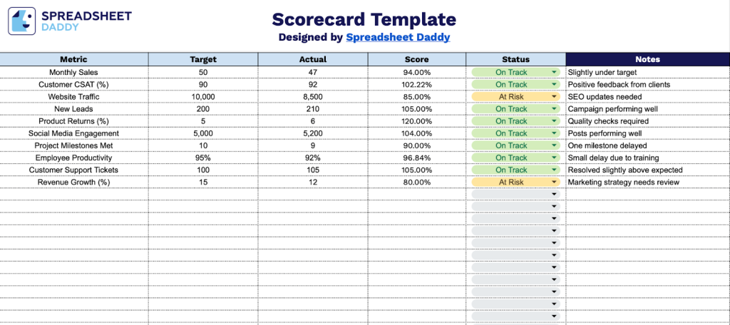 Our free Scorecard Template is professionally formatted and available in Google Sheets, Excel, and PDF.