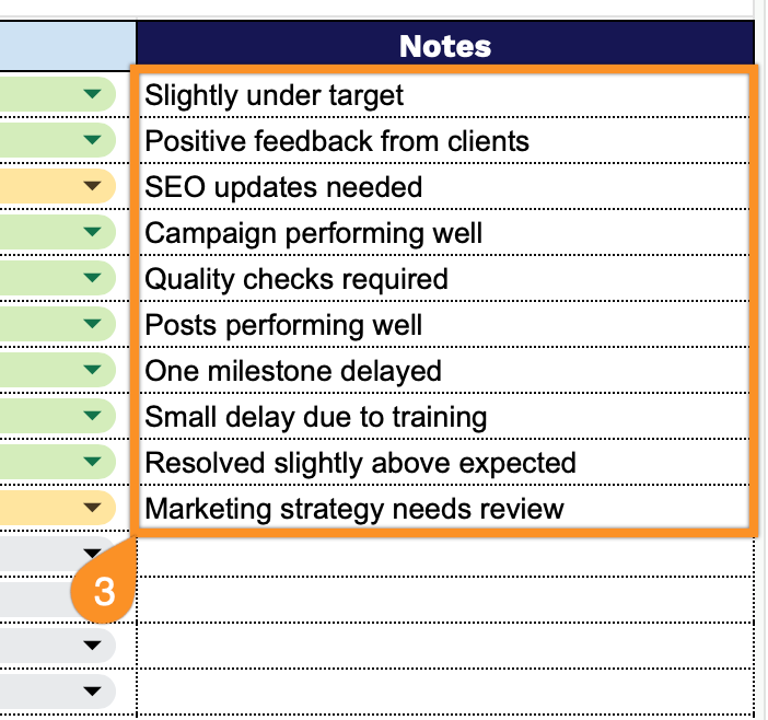 - Flexible notes and context field: Each metric row includes a dedicated Notes column where you can add qualitative context, document reasons for variance, record action items, or provide additional commentary that helps explain the numbers and supports data-driven decision-making during team meetings.
