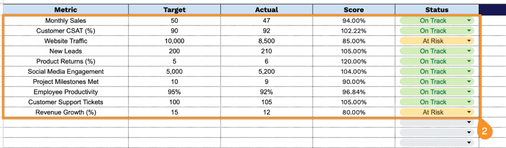 - Visual status monitoring system: Built-in Status column lets you quickly assess performance at a glance with color-coded indicators, making it easy to identify which metrics need immediate attention during reviews or stakeholder presentations.