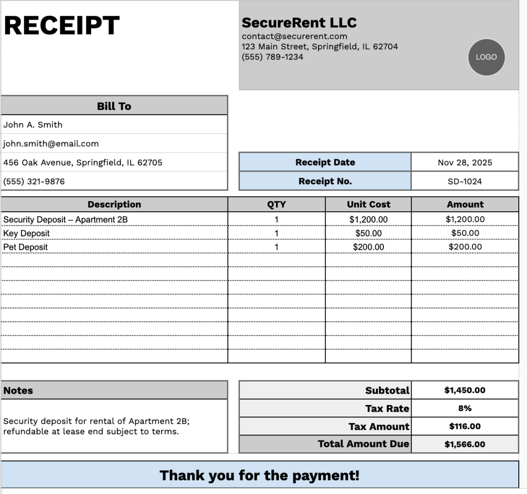 Free☝️ Security Deposit Receipt Template (Google Sheets, Excel, Word, Google Docs, & PDF Downloads)