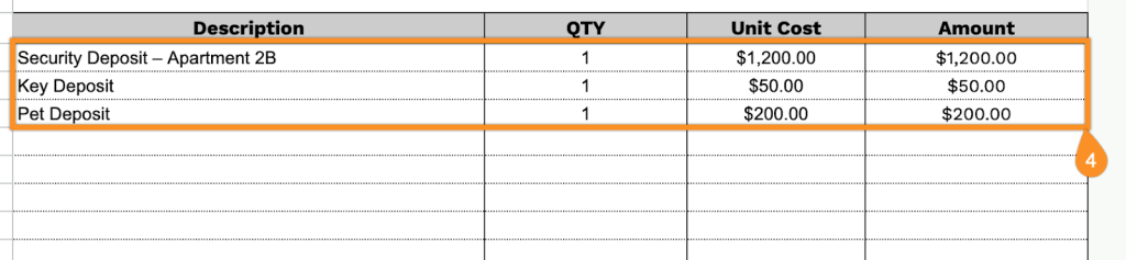 • Multi-row itemized transaction table: An 11-row grid with four columns (Description, QTY, Unit Cost, Amount) enables a detailed breakdown of security deposit charges, partial refunds, deductions, or related fees, with each line calculating individual amounts based on quantity and unit cost.