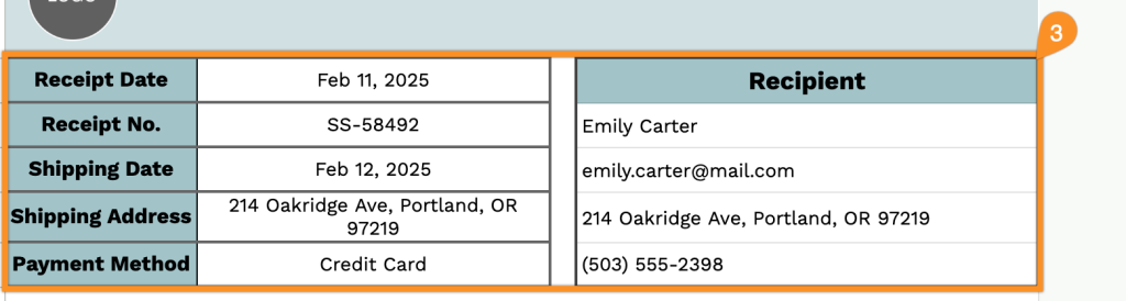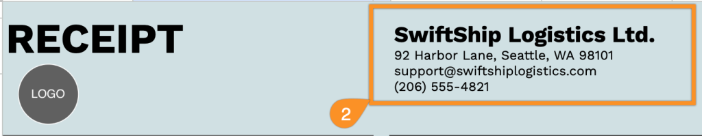 - Company and receipt header section: Customizable fields for your business branding, including company name, address, email, and phone number, along with essential receipt details such as receipt date, receipt number, shipping date, and payment method for complete transaction documentation.