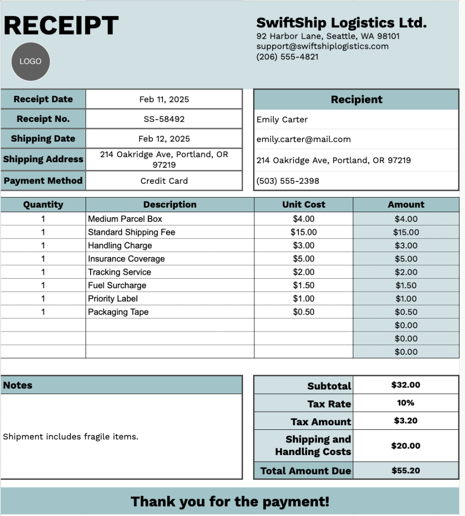 Download our free Shipping Receipt Template, compatible with Google Sheets, Excel, Word, Google Docs, and PDF. Quickly fill in shipment details, payment info, and delivery date.