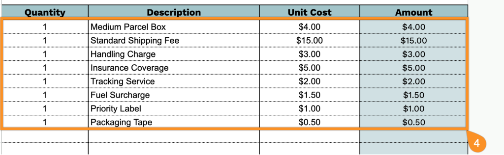 4. List the items being shipped, including quantity and price for each. The template will automatically calculate the line totals for you.