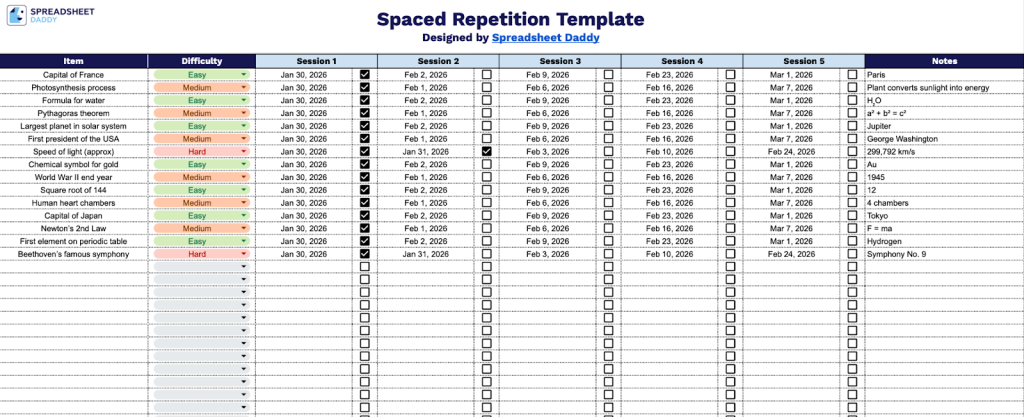 • Difficulty-based organization framework: The template’s difficulty column enables you to sort and prioritize items by challenge level, making it easy to focus on harder material more frequently while spacing out easier content according to evidence-based spaced repetition principles.