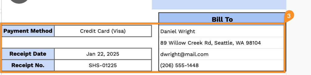 3. Complete the “Bill To” section with the recipient’s information, along with the receipt date, receipt number, and payment method.