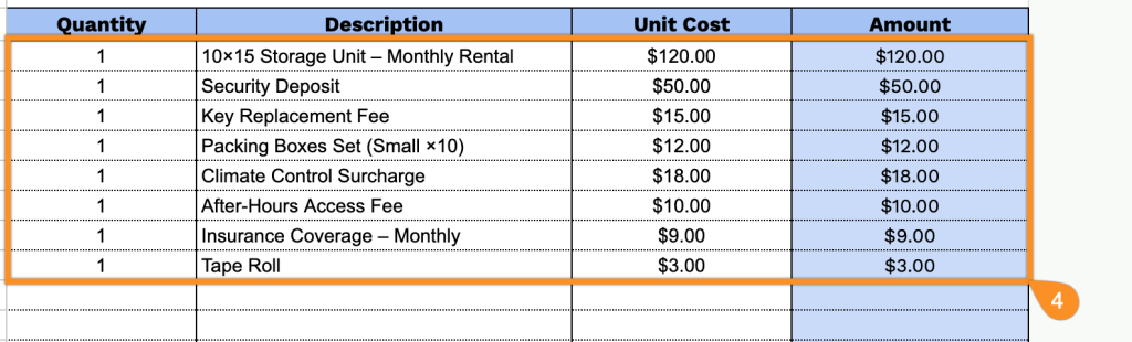 • Itemized transaction table: A structured table with columns for Quantity, Description, Unit Cost, and Amount, featuring rows to list multiple storage-related items or services with automatic calculation fields.