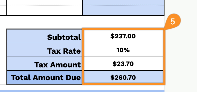 5. Add the applicable tax rate. The template will then calculate the subtotal, tax amount, and total due.