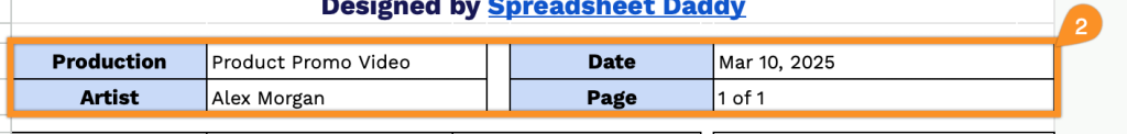 2. Enter basic project details such as the production name, artist, date, and page number.