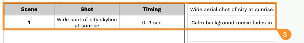 3. For each frame, fill in the scene description, shot type, and timing. Use the adjacent column to add notes, dialogue, or any extra details.