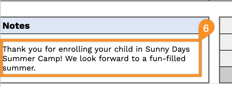 6. Use the Notes section to include any special instructions, reminders, or important details about the camp session.