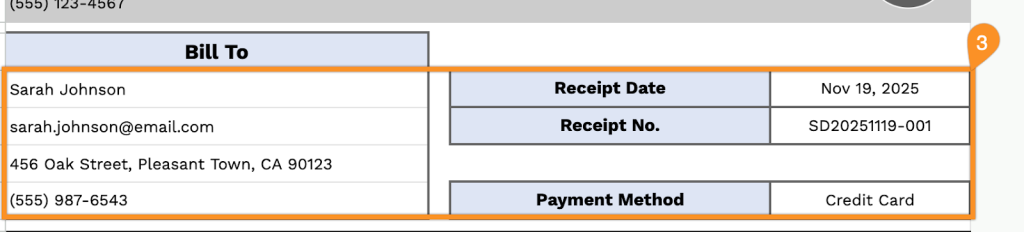 - Dual-column billing and transaction information area: The “Bill To” section on the left captures client details (name, email, address, phone) while the proper column records transaction specifics (receipt date, receipt number, payment method), creating a clear organizational structure that separates customer information from payment details.