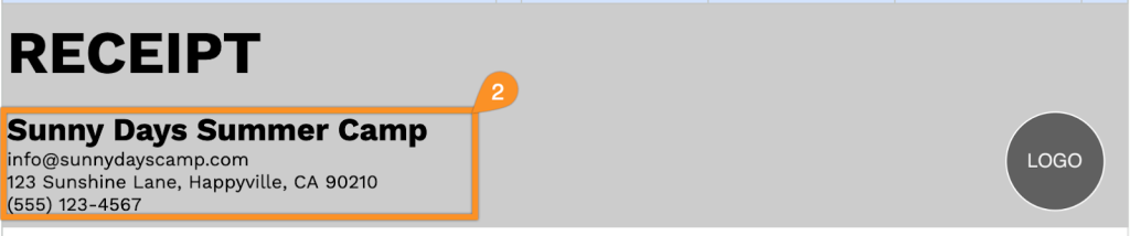 - Complete the header section with camp branding fields: Customizable areas for your camp name, contact email, physical address, and phone number let you maintain professional documentation with complete business information prominently displayed at the top of every receipt.