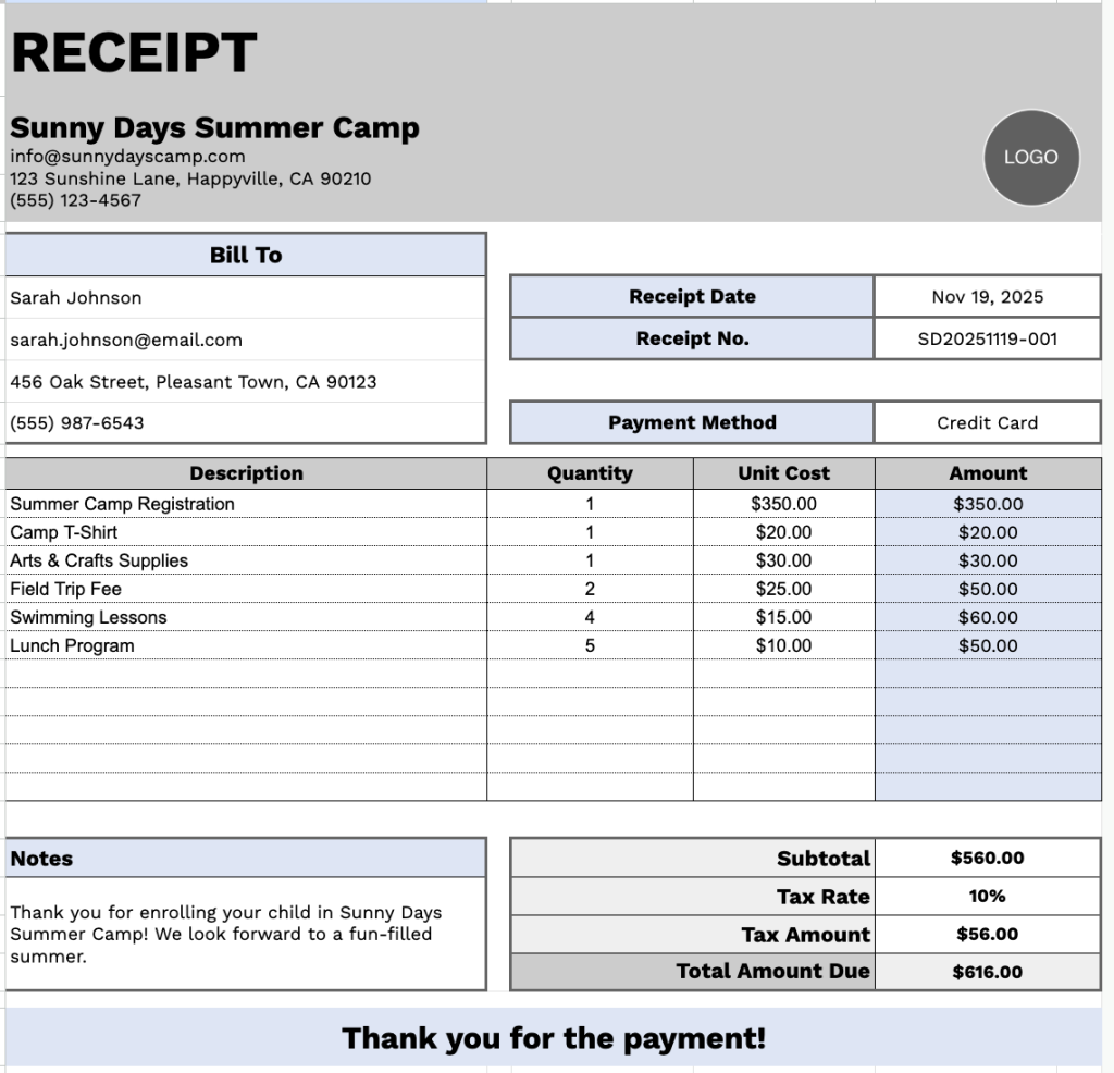 1. Grab this Summer Camp receipt template in Excel, Word, or PDF, or make your own version in Google Sheets or Docs.