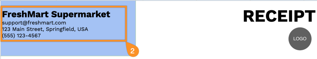 • Complete header section: Customizable fields for supermarket branding, including store name, email, physical address, and phone number, allow for complete business identification at the top of each receipt.