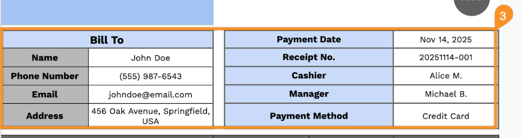 • Customer and transaction information panel: Dedicated fields for bill-to details (customer name, phone, email, address), payment date, receipt number, cashier name, manager name, and payment method provide comprehensive transaction tracking and record-keeping.
