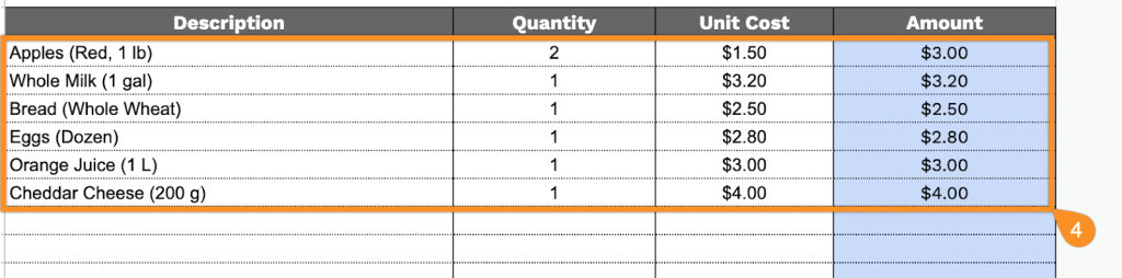 • Multi-row itemization table: A table with four structured columns (Description, Quantity, Unit Cost, Amount) and pre-formatted rows enables you to list groceries, household items, beverages, produce, or additional products with a precise pricing breakdown for transparency and clarity.