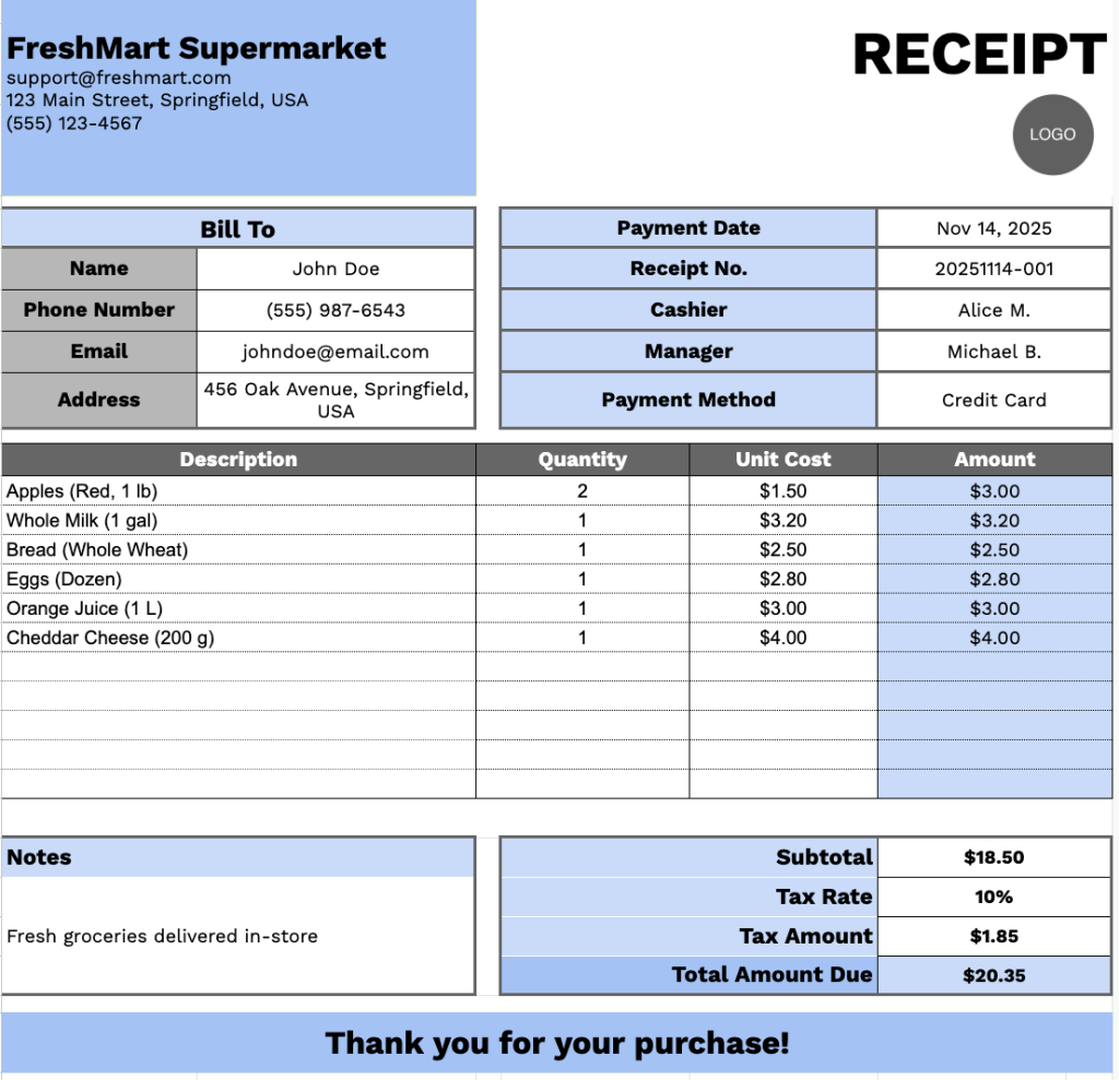 Free☝️ Supermarket Receipt Template (Google Sheets, Excel, Word, Google Docs, & PDF Downloads)