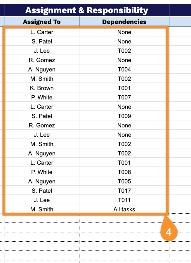 - Assignment and dependency management: Designate clear ownership with the Assigned To column for accountability tracking. The Dependencies field helps you map task relationships and identify which activities must be completed before others can begin.