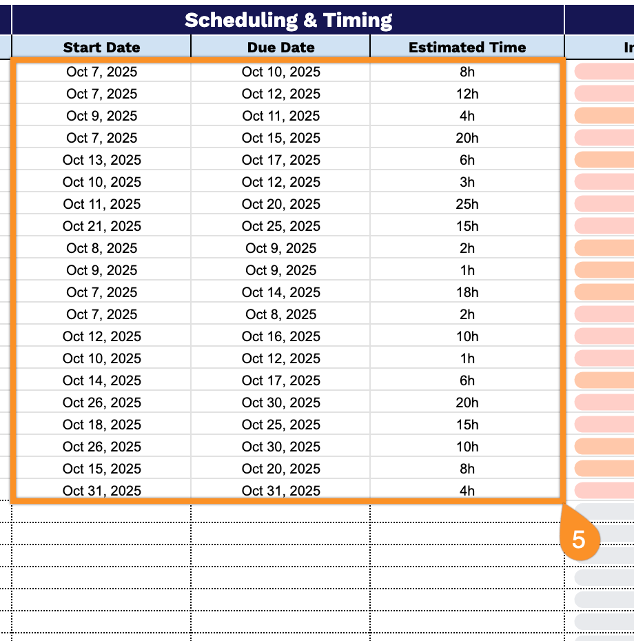 - Scheduling and time allocation: Plan and track timelines effectively with Start Date and Due Date columns for deadline management. The Estimated Time field lets you forecast resource requirements, balance workloads, and create realistic project schedules.