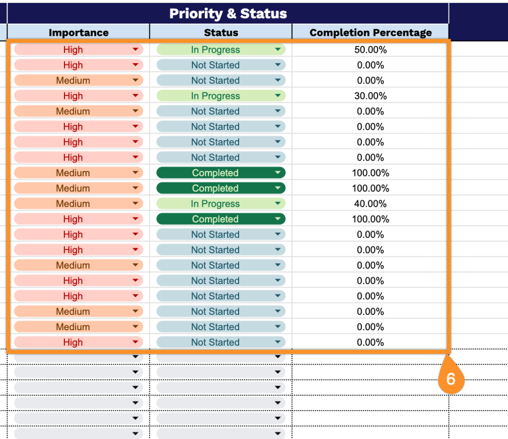 - Priority tracking and progress monitoring: Evaluate task urgency through the Importance field for ranking critical activities. Track current progress with the Status column, monitor completion percentages for detailed visibility, and document task-specific updates in the additional Notes column for ongoing context and communication.