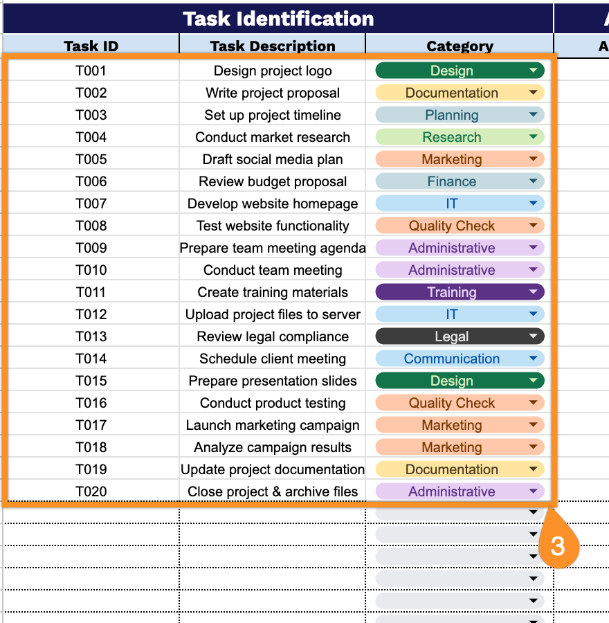 - Task identification system: Organize and categorize tasks efficiently with unique Task ID numbers for reference tracking, detailed Task Description fields for comprehensive activity explanations, and Category classification to group related tasks by department, project phase, or work type.