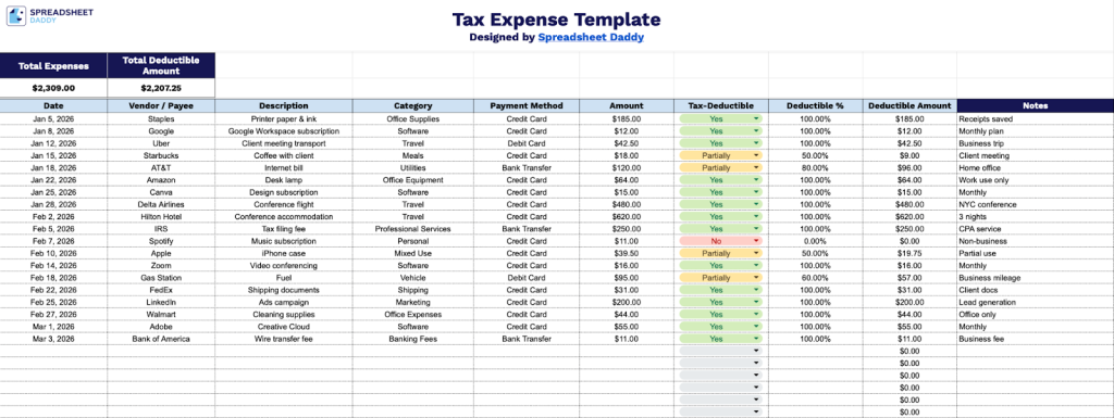 - Flexible deductibility tracking system: The Tax-Deductible and Deductible % columns work together to accommodate both fully deductible and partially deductible expenses, with the Deductible Amount column automatically calculating the exact dollar value eligible for tax purposes based on your specified percentage.