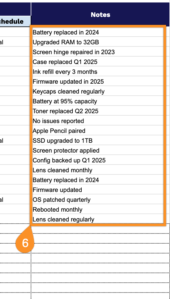 - Maintenance Schedule: Record the planned maintenance intervals, service dates, and any warranty or support agreements associated with the asset.