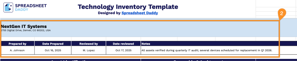 2. Record your company name, location, and IT inventory coordinator details with the date finalized. Include manager and inspection dates, and use Notes to document observations about the technology assets.