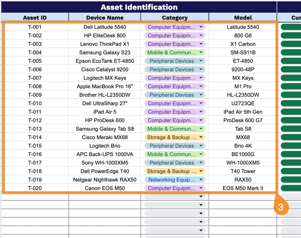 - Asset ID: Enter the unique identifier or serial number assigned to each technology asset for inventory tracking and auditing purposes.
