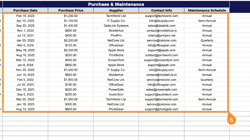 - Integrated purchase and maintenance records: Capture financial data like Purchase Date and Purchase Price alongside maintenance scheduling information. You can monitor equipment lifecycles, budget for replacements, and ensure timely servicing without having to manage separate documents.