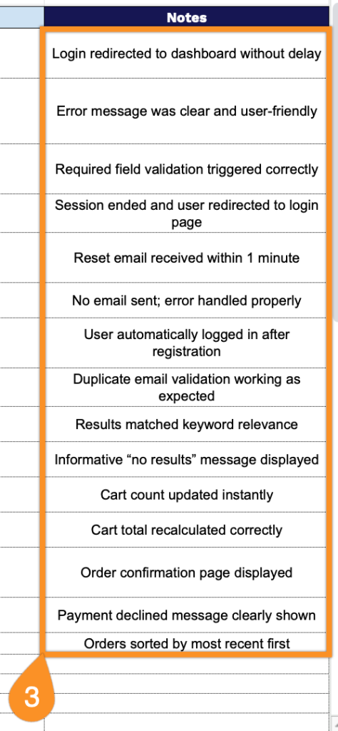 3. Use the Notes section to record extra observations, special conditions, or essential details for each test case.