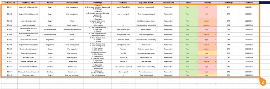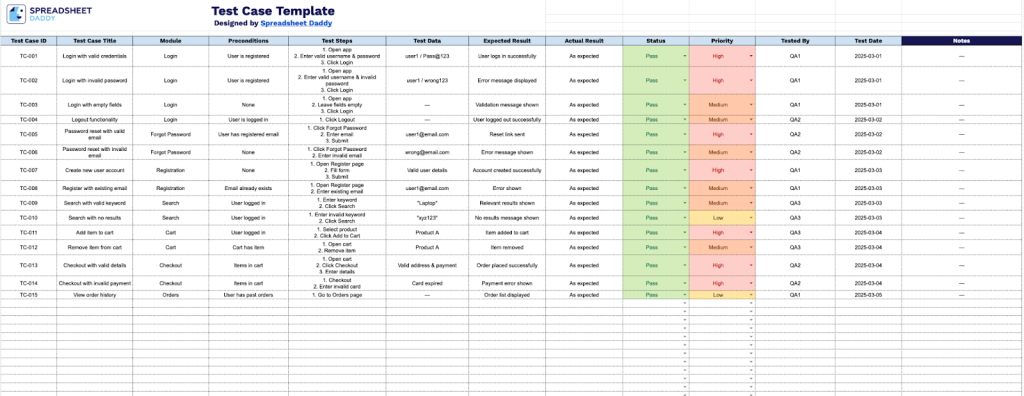 - Standardized priority and status tracking system: Built-in columns for categorizing test cases by priority level (High, Medium, Low) and recording execution status (Pass/Fail), enabling you to quickly identify critical test cases and monitor testing progress at a glance throughout your QA cycle.